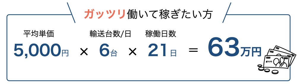 「それぞれのペースで、しっかり稼ぐ」が城南輸送のモットーです。一例ですが、以下のような支給実績があります。(※本シミュレーションは業務委託契約の場合を想定しています)