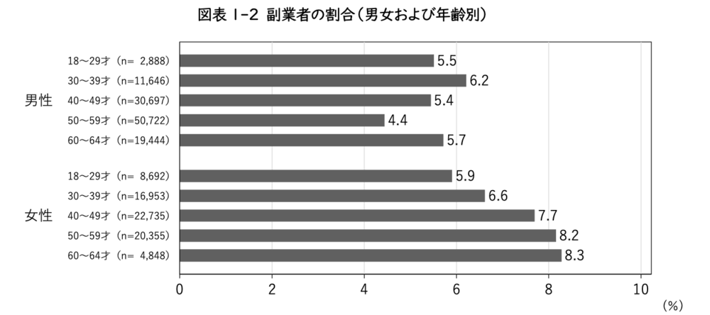 とくにコロナ禍以降、「収入源を増やしたい」「空いた時間を有効活用したい」という考える人が増え、実際に副業をする人の割合は年々上昇しています。以下は、男女および年齢別で副業をする方の割合です。